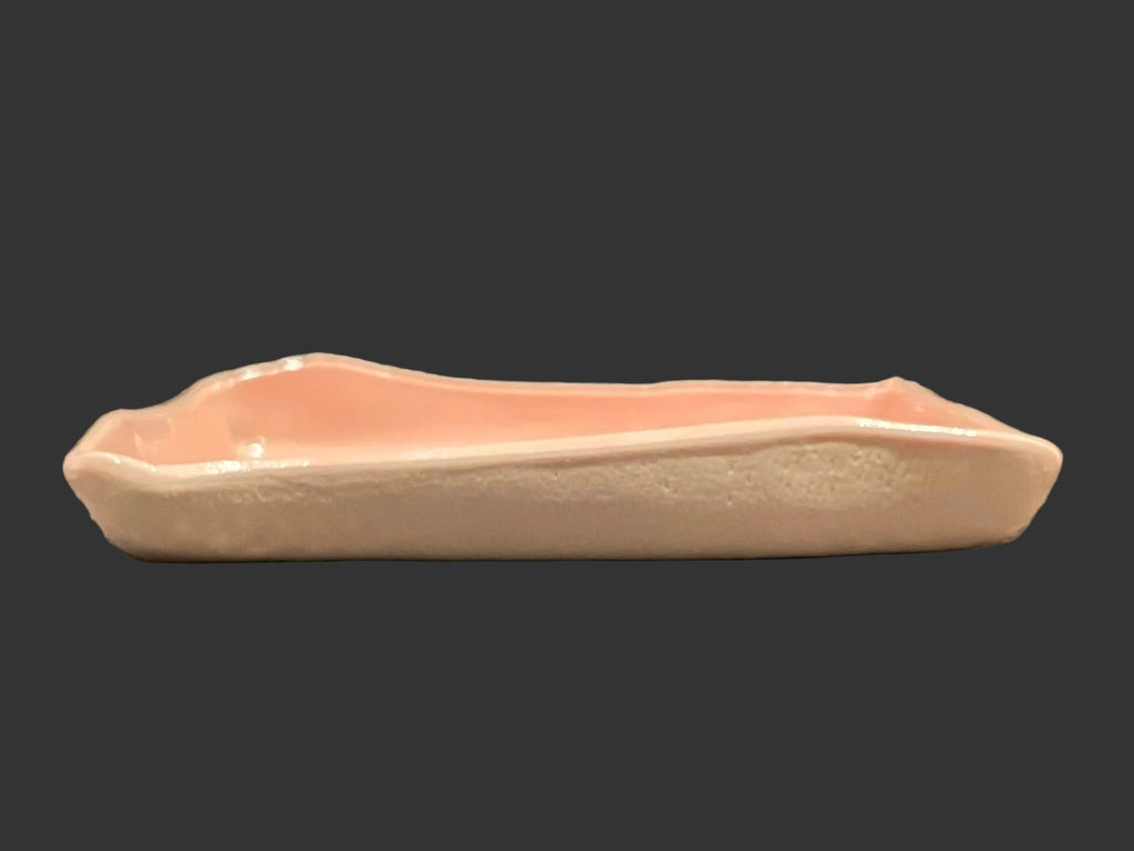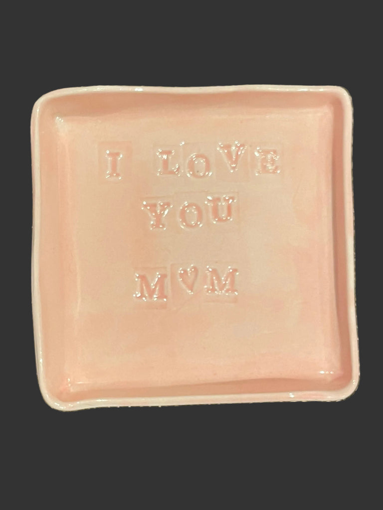 Porcelain clay with hand stamped “I LOVE YOU MOM” in pink.